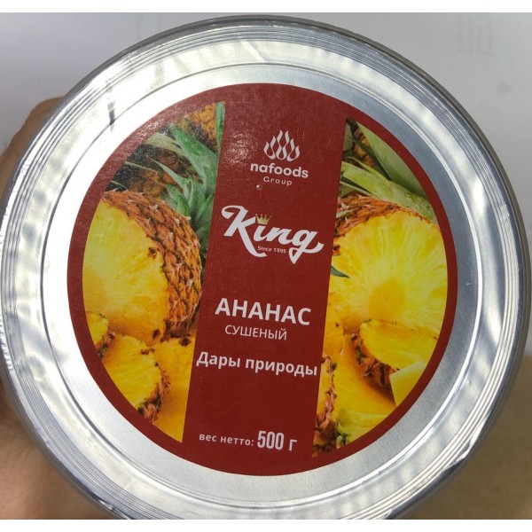 Ананас сушеный King Nafoods, в банке 500 гр. Продукты Кинг - это сушеные экзотические фрукты из Вьетнама БЕЗ САХАРА. Продукты King изготавливаются компанией Nafoods (НАФУДС ГРУПП) во Вьетнаме. В нашем магазине представлена вся линейка сухофруктов King Nafoods.
