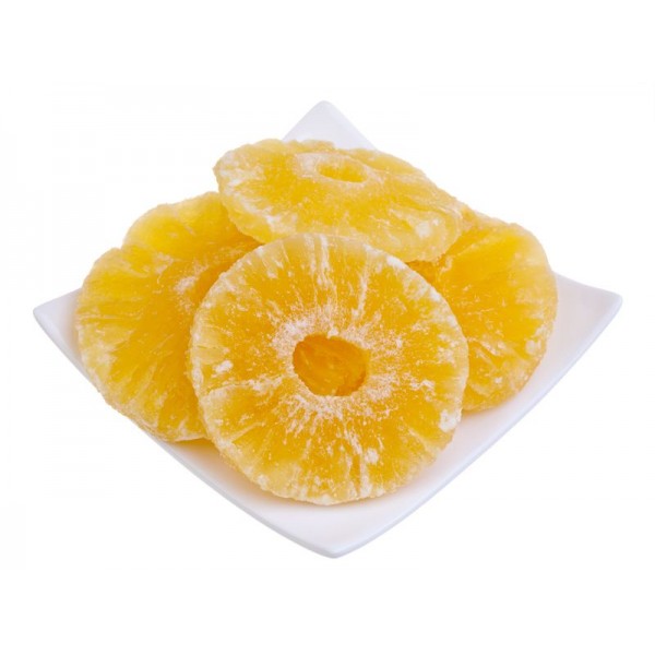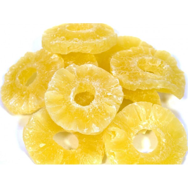 Ананасы тщательно вымачивают в сладком сиропе из сахара и воды, после сушат, так получаются всем известные ананасовые кольца. Польза от такого продукта совершенно идентична от натурального плода. Уровень клетчатки и углеводов очень велик, а калорийность выше, чем в свежем ананасе.